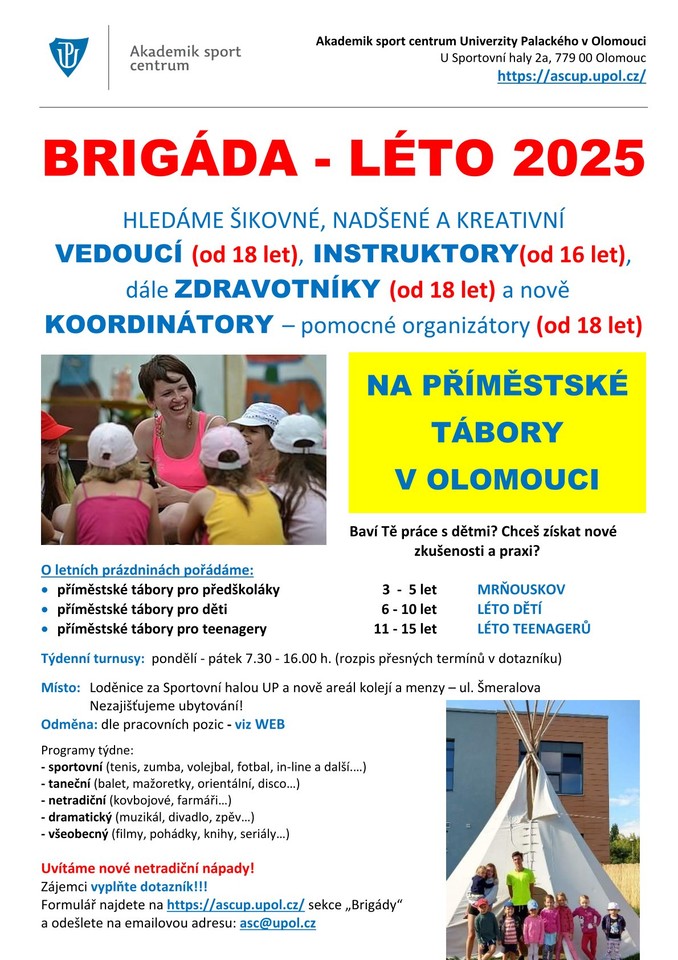 Hledáme vedoucí, zdravotníky a koordinátory na příměstské tábory Léto dětí 2025. Zájemci vyplní dotazník a zašlou na asc@upol.cz