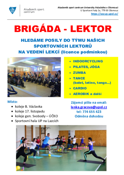 Akademik sport centrum UP hledá posily do týmu našich sportovních lektorů na vedení lekcí (licence podmínkou) - např. jóga, pilates, zumba, tabata, aerobik, cardio box, indoorcycling, balet, latino, společenské tance, tango a jiné...