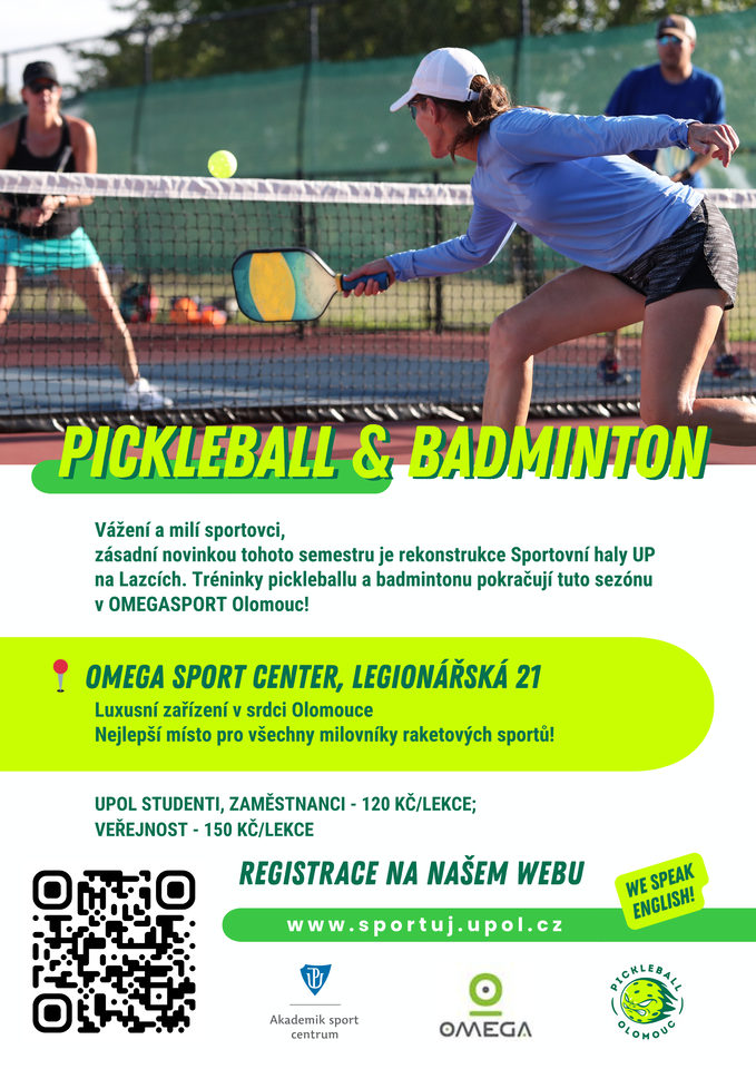 - PICKLEBALL (lektorka N.Kruzman) - úterý 14.00 - 15.00, UPOL Studenti, zaměstnanci 120 Kč/lekce; VEŘEJNOST 150 Kč/lekce - "AKADEMIK - základní kredit"